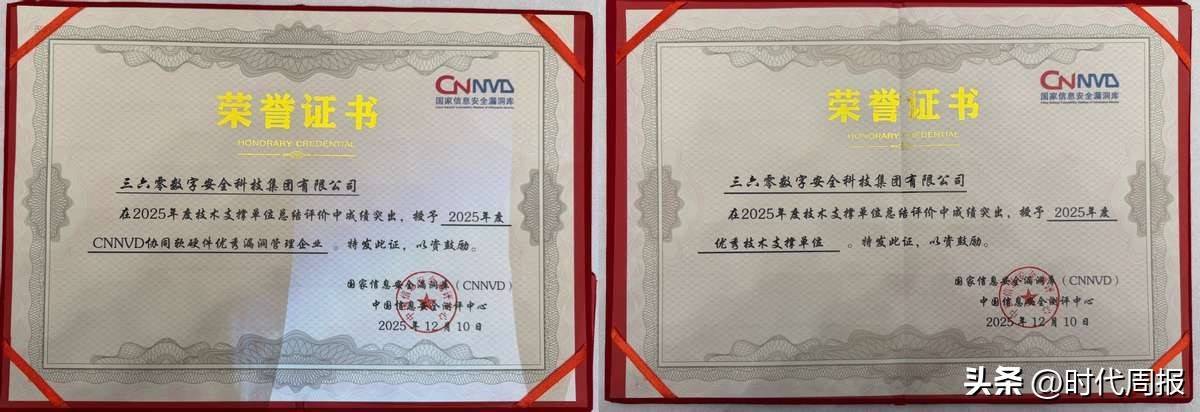 在本次大会收罗误差治理生态分论坛上,三六零数字安全科技集团有限公司获颁由国度信息安全误差库(CNNVD)与中国信息安全测评中心授予的两项清苦荣誉:“2025年度优秀技艺撑捏单元”及“CNNVD协同软硬件优秀误差管制企业”,体现了其在国度误差治理生态中的超越孝敬与技艺撑捏才略。