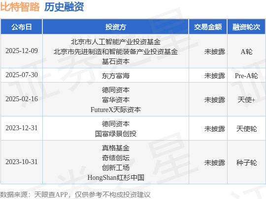 证券之星音讯,凭证天眼查APP于12月9日公布的信息整理,北京比特智路信息技艺有限公司A轮融资,融资额未显露,参与投资的机构包括北京市东谈主工智能产业投资基金,北京市先进制造和智能装备产业投资基金,基石老本。