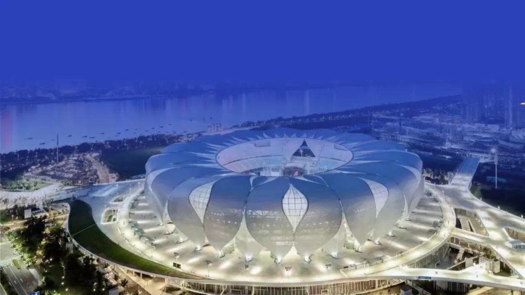 领先我们新建一页 PPT,插入杭州亚运会的会馆图片:
